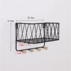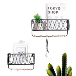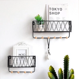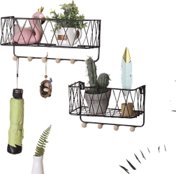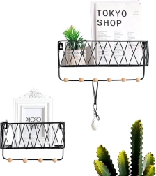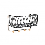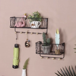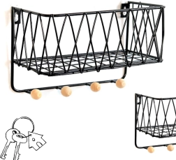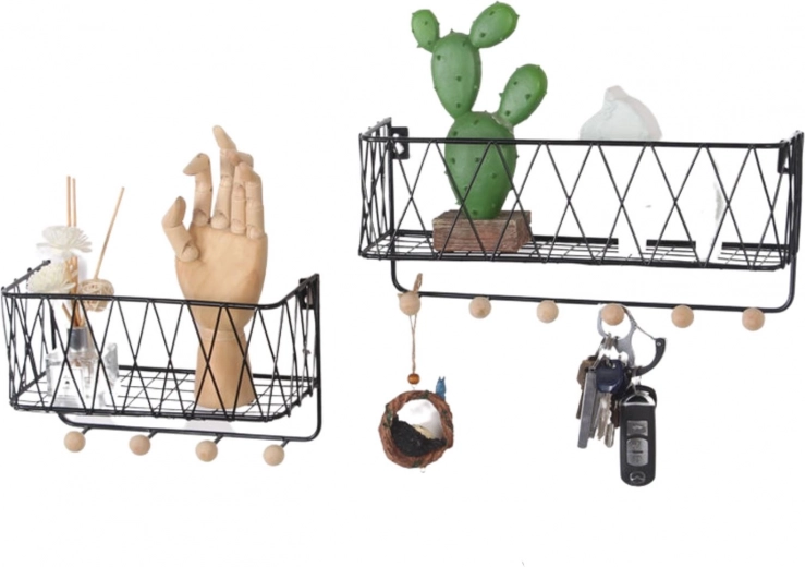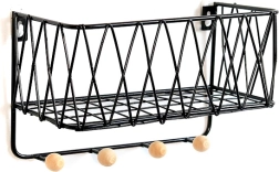 Cette étagère filaire moderne allie design et fonctionnalité. La surface supérieure accueille des décorations et de petits objets, tandis que les crochets inférieurs maintiennent clés, foulards ou sacs légers bien suspendus. La finition noire se marie facilement à la plupart des intérieurs et offre un rendu épuré et intemporel.