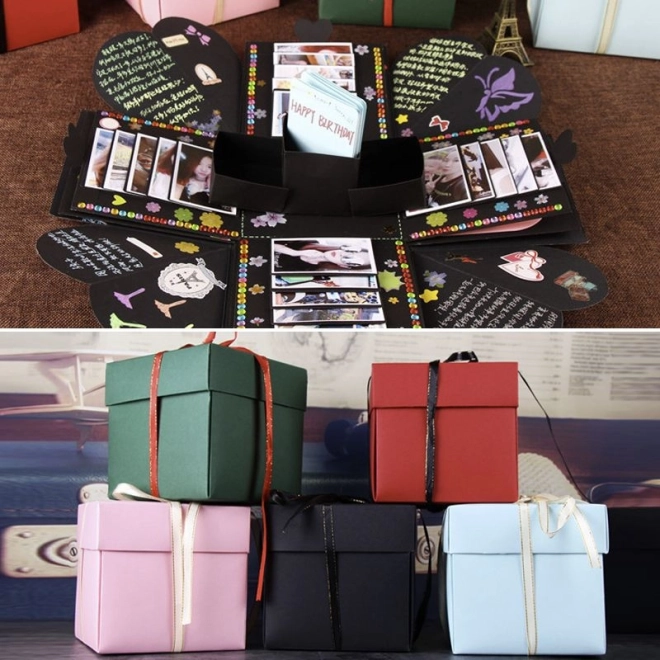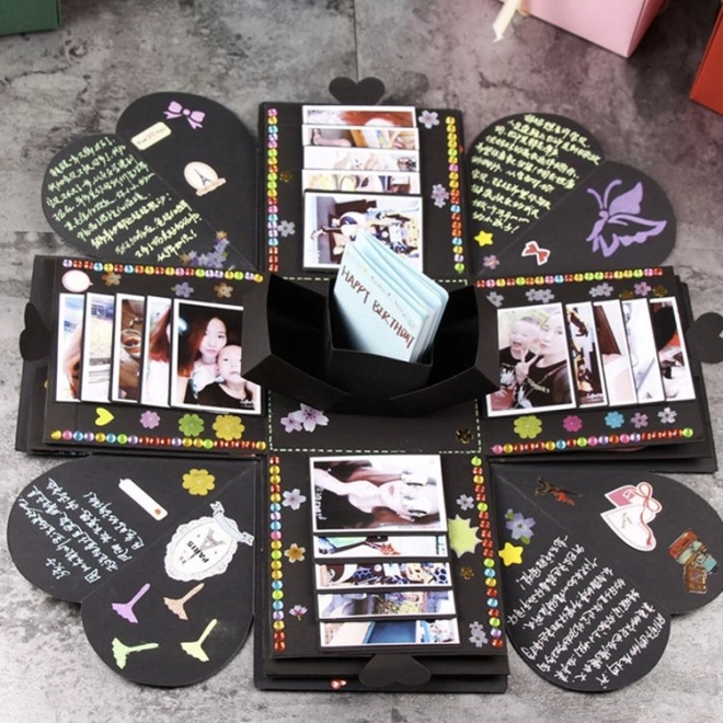 Surprenez vos proches avec un cadeau unique: la boîte cadeau noire explosive. Cette boîte est une surprise parfaite pour un mariage, la Saint‑Valentin, des fiançailles, un anniversaire ou toute autre occasion festive. Dans la plus petite boîte, vous pouvez placer un bijou, une montre ou un autre petit présent. Décorez l’intérieur avec des photos, des cartes ou tout ce qui vous inspire, et faites de ce cadeau quelque chose de inoubliable.