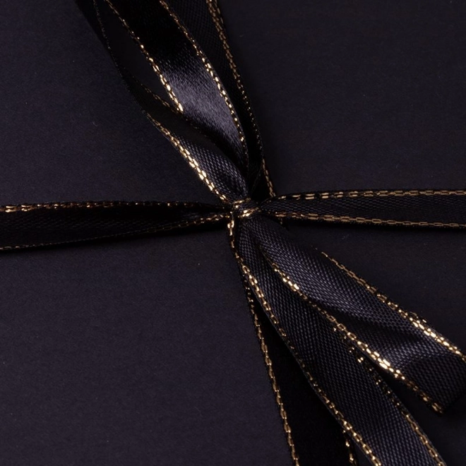 Boîte avec ruban noir et surpiqûres dorées, idéale pour une présentation de cadeau élégante.