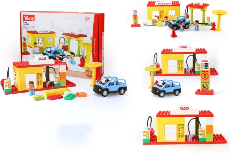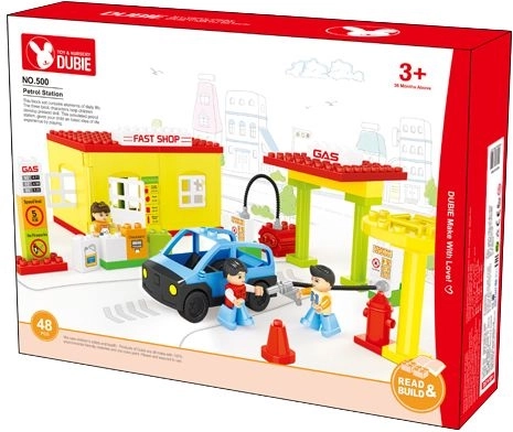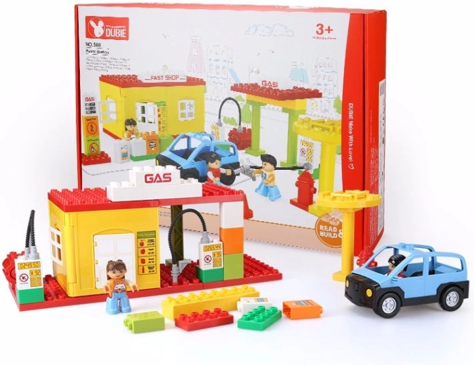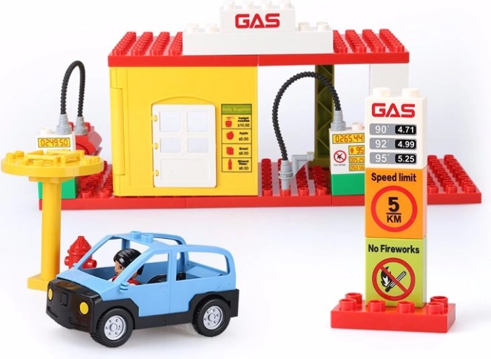 Station-service jouet pour enfants. Venez avec votre véhicule et faites le plein de carburant. L’ensemble comprend deux figurines et un guide de montage.