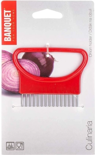 Un assistant pratique pour une coupe de l’oignon rapide, précise et sécurisée. Le support BANQUET Culinaria de couleur rouge mesure 10,7 × 7,8 cm et combine acier inoxydable et plastique résistant. Il est compatible lave-vaisselle, facilite des tranches uniformes et protège les doigts pendant l’utilisation.