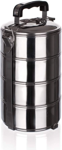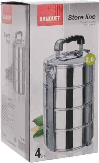 Le set de contenants alimentaires STORY LINE, 4 pièces en acier inoxydable, est conçu pour le transport des aliments et des plats cuisinés. L’ensemble comprend 4 bols en inox d’un diamètre de 13 cm et d’une hauteur de 5,7 cm. Hauteur totale de l’ensemble : 21,8 cm, épaisseur du matériau : 0,5 mm.