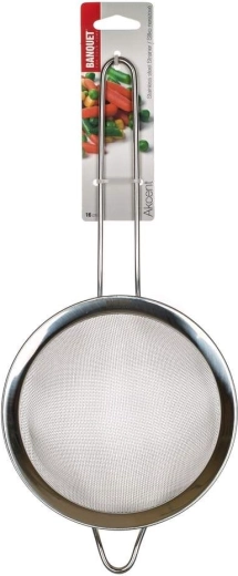 La passoire de cuisine Akcent d’un diamètre de 16 cm est dotée d’une poignée pratique de 17 cm, terminée par un œillet pour un accrochage facile. Fabriquée en acier inoxydable 202 de qualité, elle offre une densité de maille de 20 mailles par cm², garantissant une filtration parfaite.