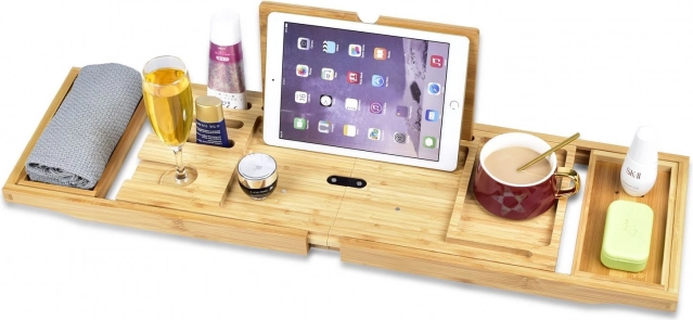 Équipée d'un espace pour tablette et d'un porte-verre à vin, vous pouvez vous détendre pleinement. Le plateau peut accueillir un livre, des produits de bain, ou une bougie.