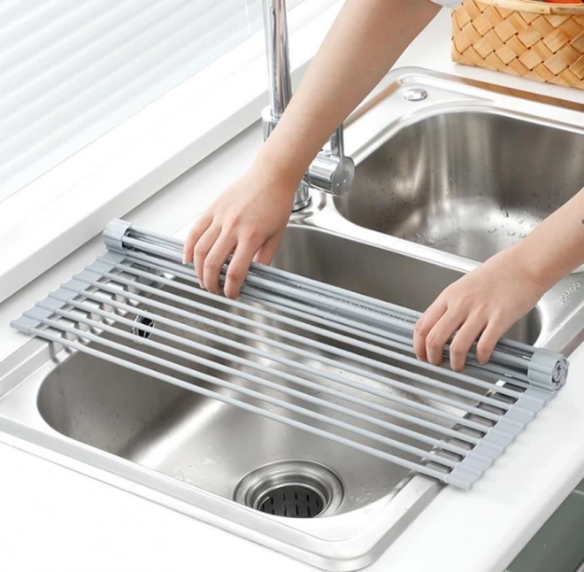 Tapis d'égouttage enroulable gris pour vaisselle et légumes