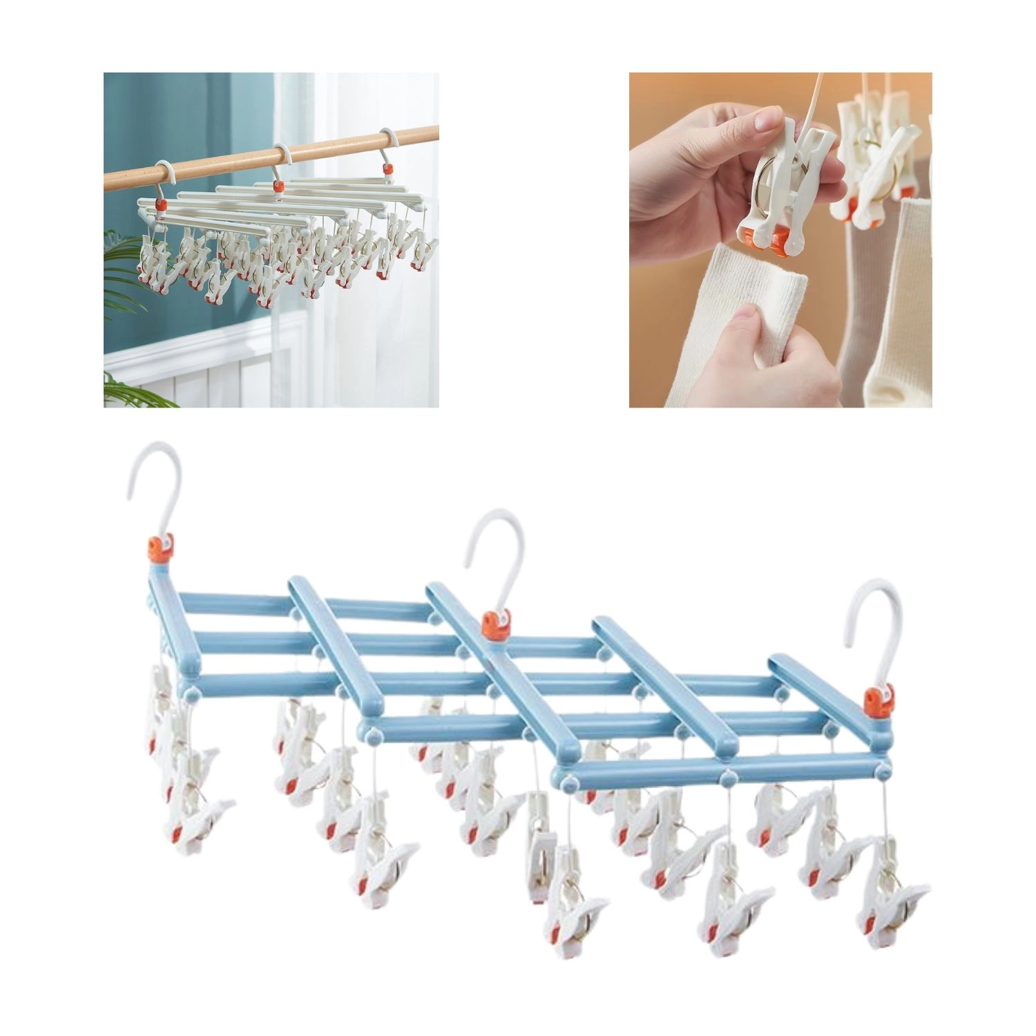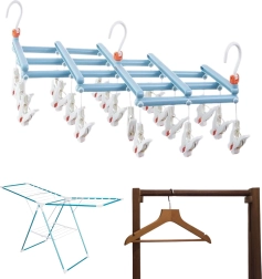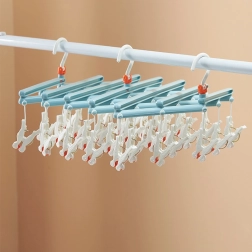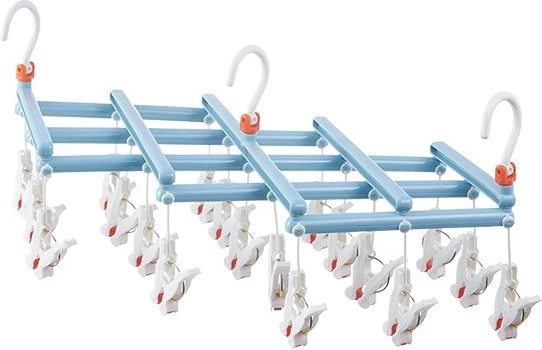 Pratique étendoir pliable avec 19 pinces, idéal pour sécher chaussettes, sous-vêtements et petits vêtements. Structure en plastique légère et résistante, crochet pivotant pour une suspension facile et pliage compact pour un gain de place, en font un accessoire fiable à la maison, sur le balcon et en voyage.