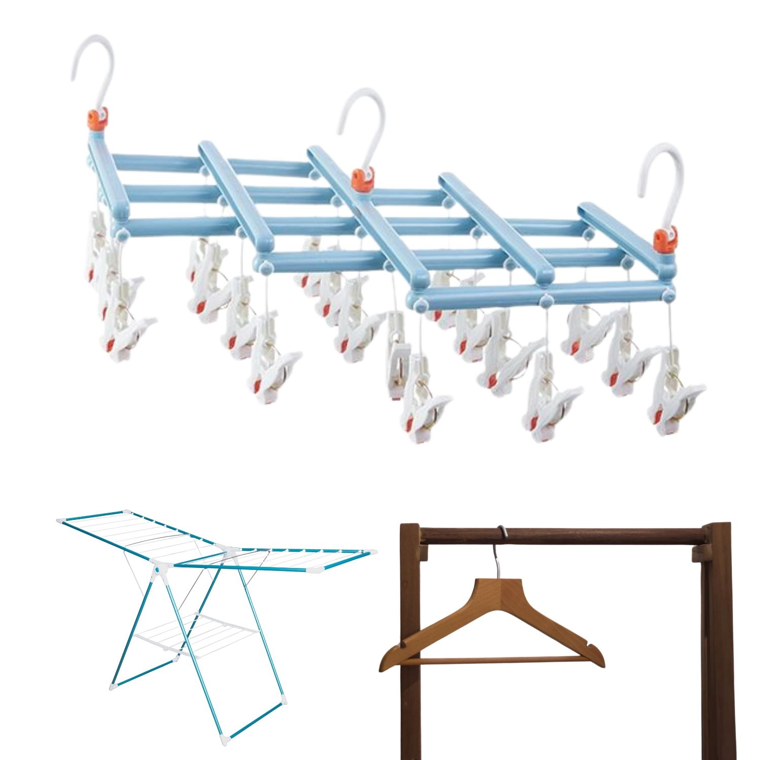 Étendoir à linge pliable avec pinces, 19 pinces, bleu clair