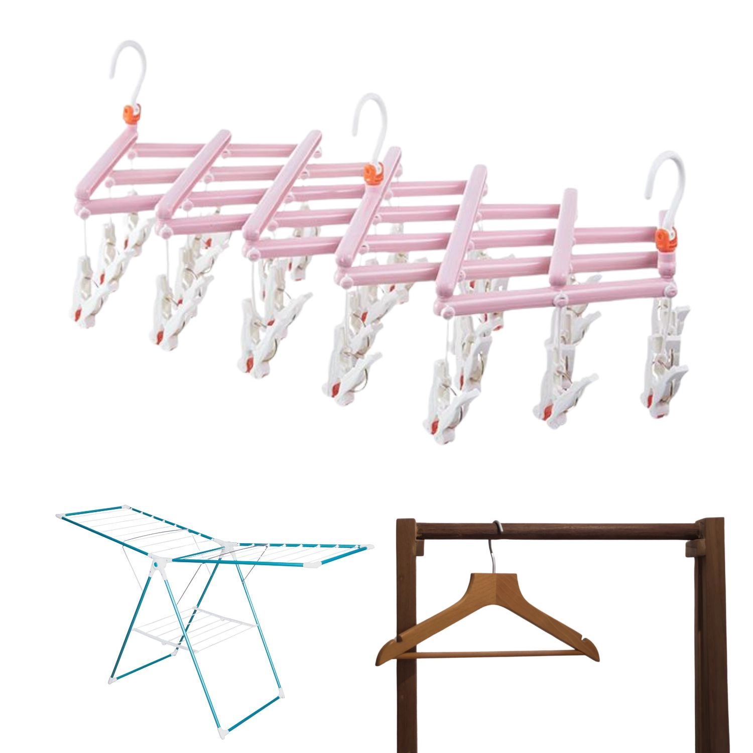 Séchoir pliant pour linge avec pinces, 29 clips, rose