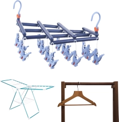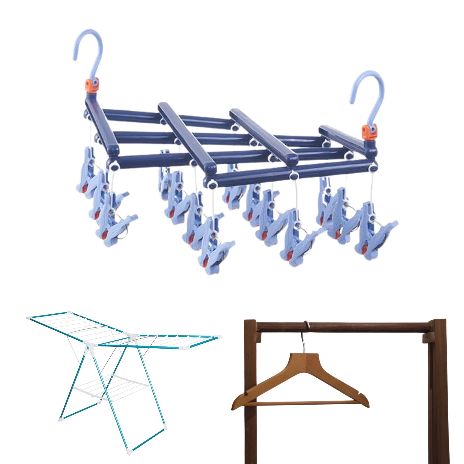 Séchoir pliable avec pinces, 14 clips, bleu foncé