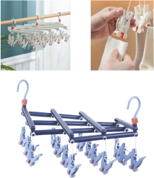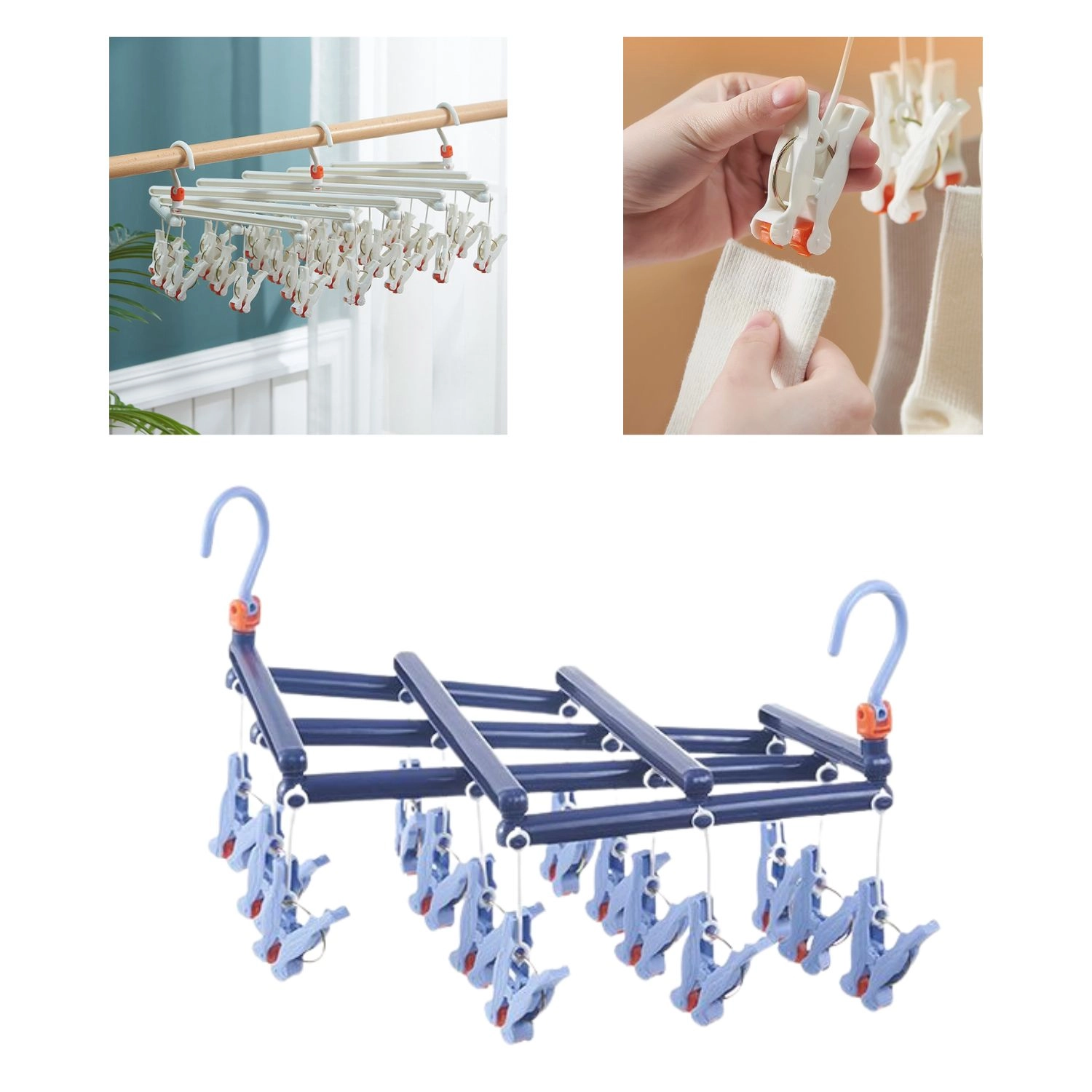 Pratique, le séchoir pliable avec 14 clips est idéal pour sécher chaussettes, sous-vêtements et petites pièces à la maison comme en voyage. Grâce au plastique résistant, au crochet rotatif et à ses dimensions compactes, il offre un gain de place, une utilisation facile et une suspension universelle sur tringle, corde ou étendoir.
