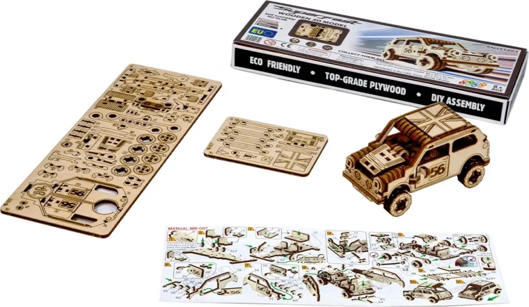 Le kit comprend 98 pièces et peut être assemblé en environ 40 minutes. Le niveau de difficulté est facile, ce qui en fait une excellente porte d’entrée dans l’univers des maquettes en bois, ainsi qu’un projet convivial pour une soirée en famille. Ses dimensions compactes (84 × 39 × 41 mm) permettent de l’installer presque partout.