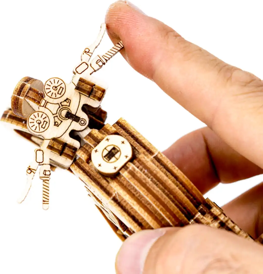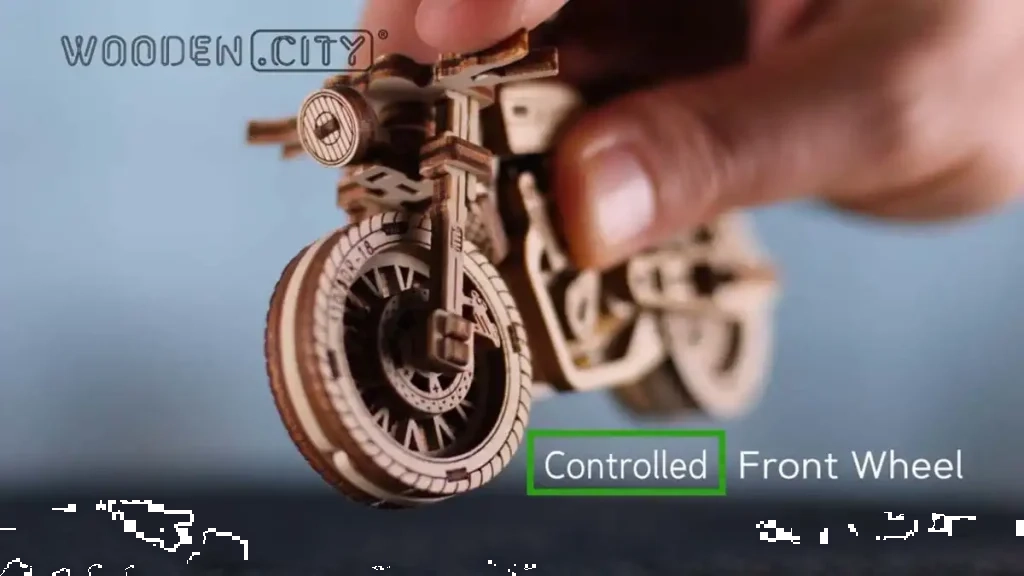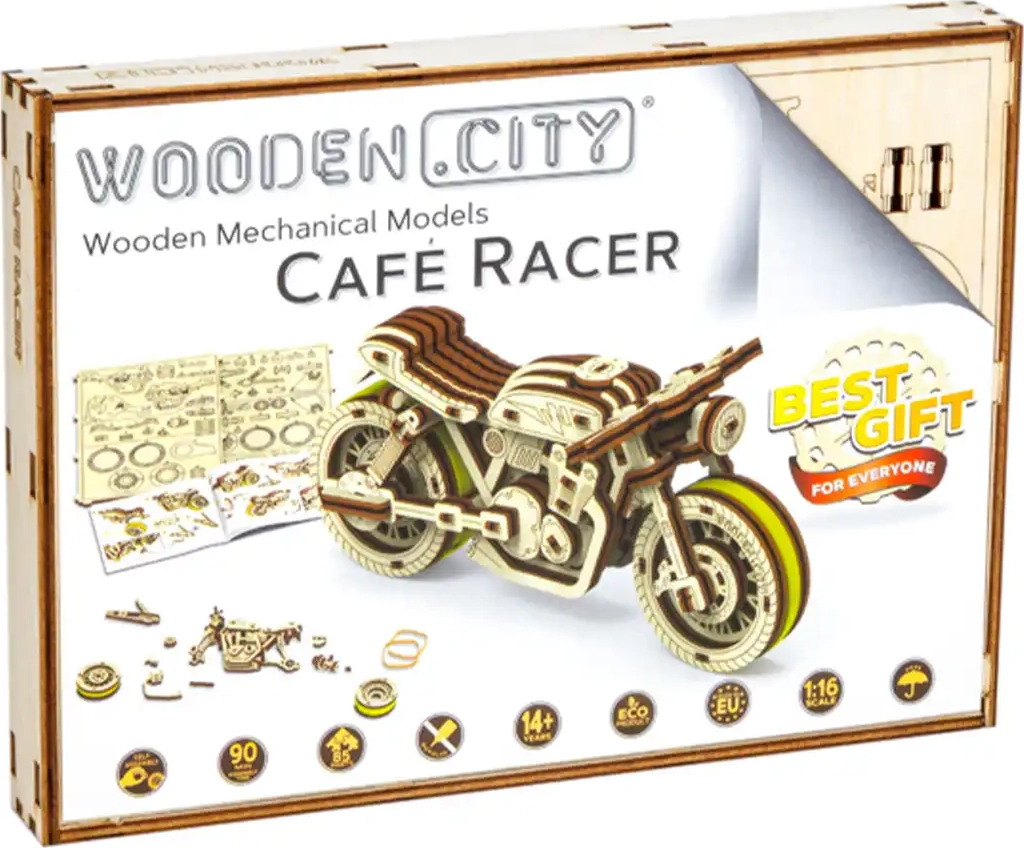 La moto Café Racer de WOODEN CITY est un modèle en bois minutieusement conçu à l’échelle 1:16, qui donnera vie à votre bureau ou vitrine. Grâce au moteur à élastique et au mécanisme de rappel, le modèle se déplace en avant et en arrière, atteint environ 1 mètre et offre une vue sur la mécanique réelle des engrenages.