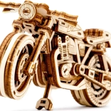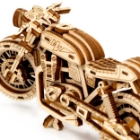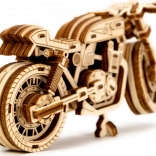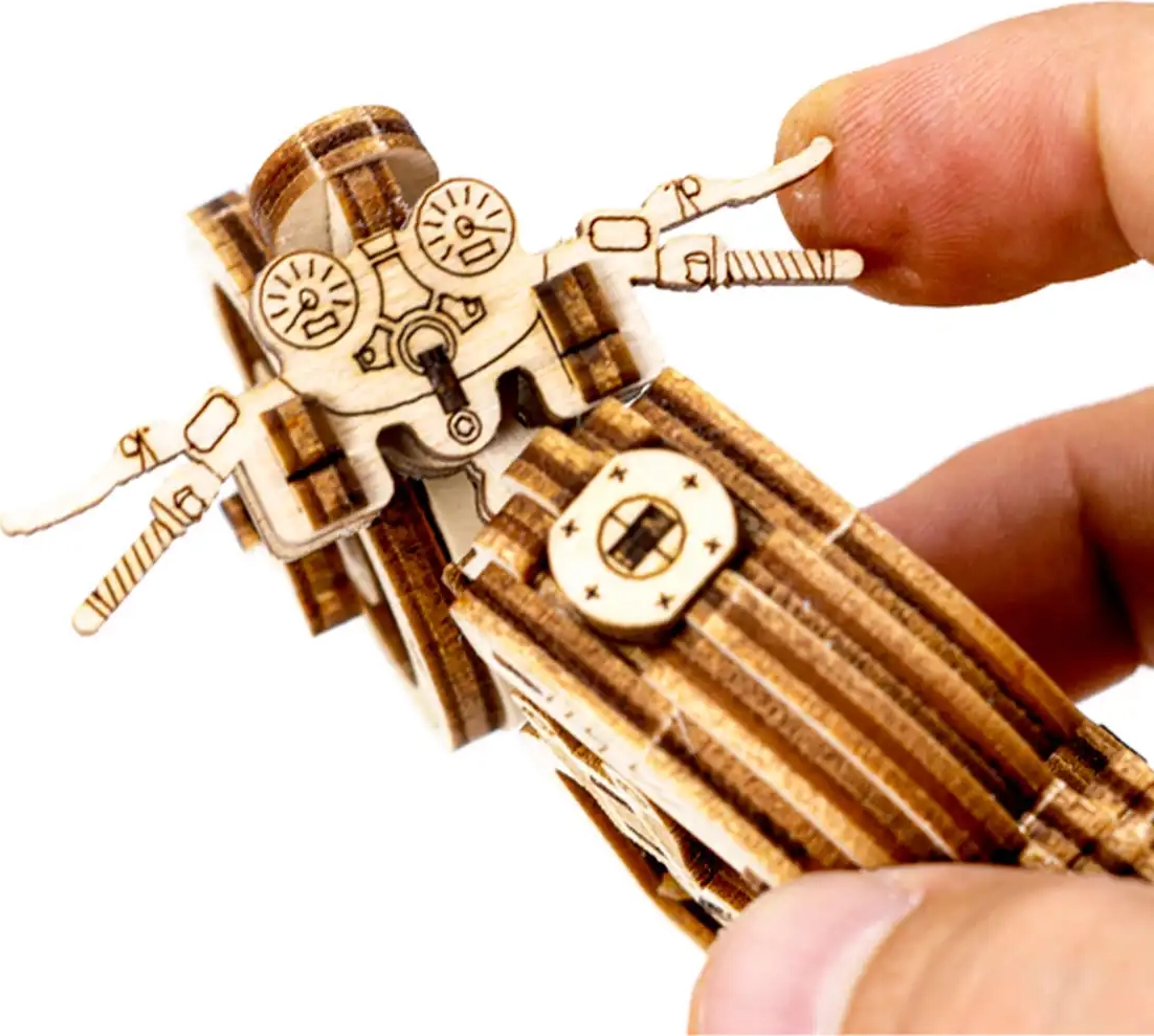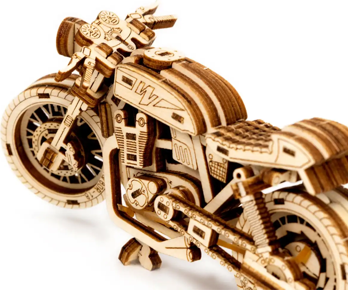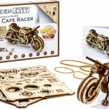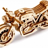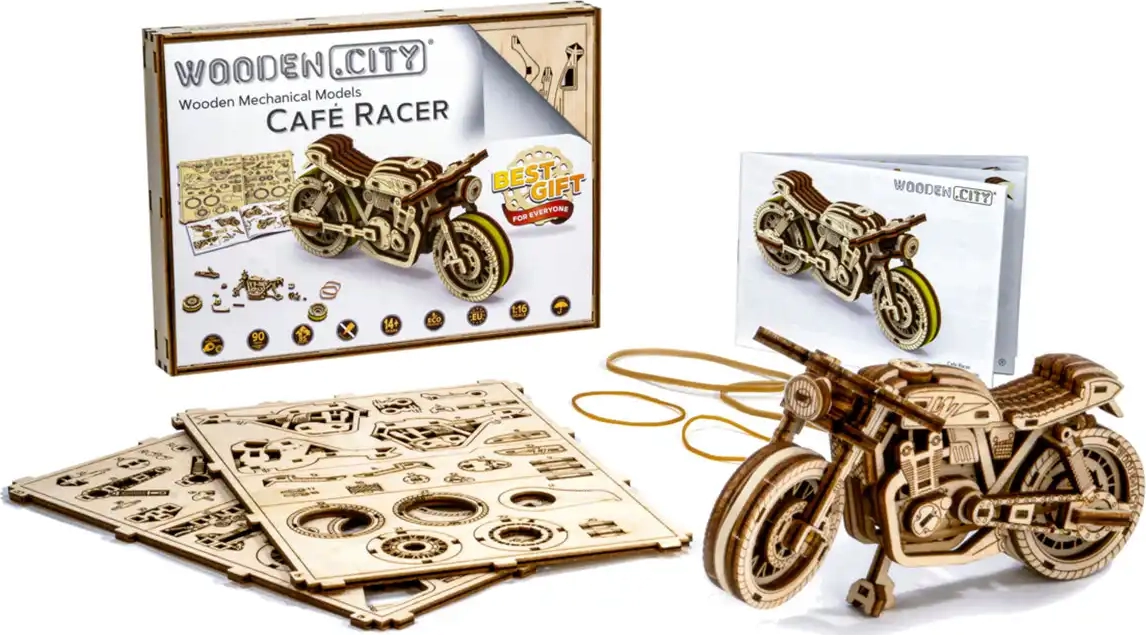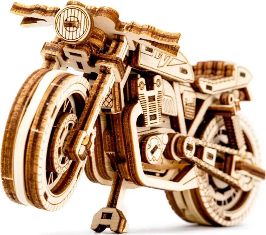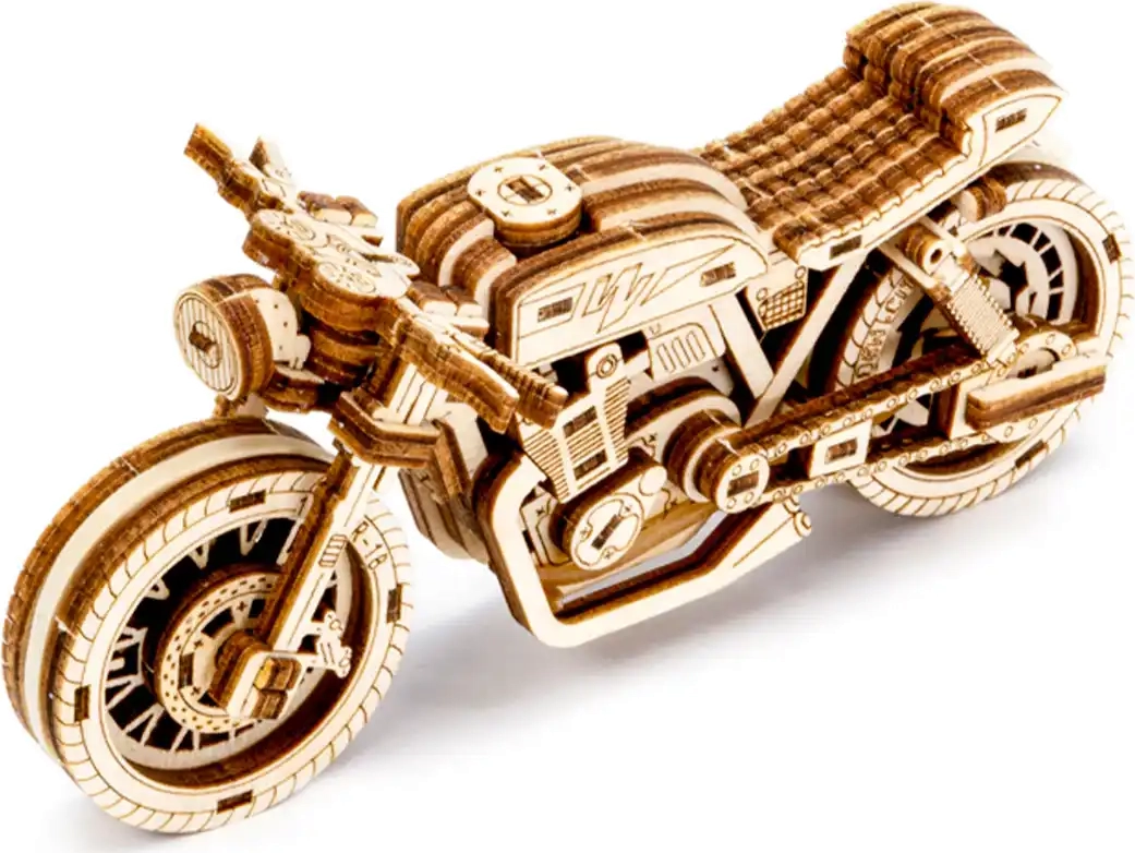 Construisez une élégante moto Café Racer en contreplaqué naturel et profitez de sa mécanique fonctionnelle. Grâce à la marche arrière et au moteur à élastique, le modèle parcourt jusqu’à 1 mètre, dispose de roues caoutchoutées, d’un mécanisme à volant d’inertie et de commandes réalistes. Le montage se fait sans colle ni outils et l’emballage sert de support.