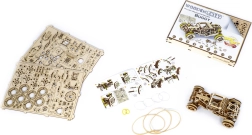 Les pièces découpées au laser dans un contreplaqué de bouleau s’emboîtent avec précision. Pour un fonctionnement fluide, il suffit d’enduire de cire les axes et les engrenages selon le manuel.