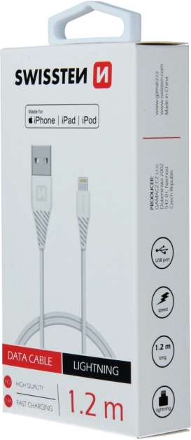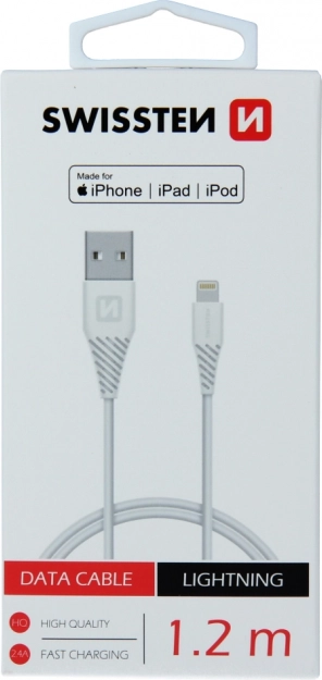 Câble de données TPE Swissten USB/LIGHTNING certifié MFI, longueur 1,2 m. Emballé en conditionnement de vente au détail Swissten.