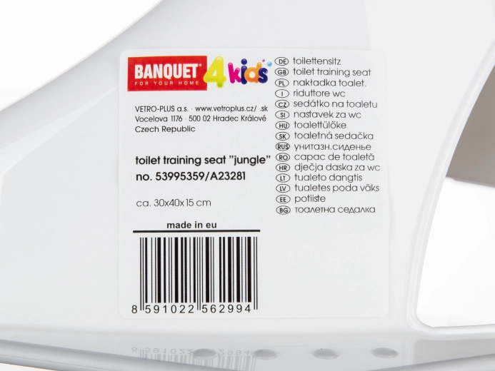 L’abattant WC JUNGLE est un réducteur de toilette spécial pour enfants qui commencent à aller aux toilettes seuls. Le réducteur de WC avec surface antidérapante est une version réduite d’un abattant WC classique, empêchant l’enfant de glisser dans la cuvette. La planche est fabriquée en plastique souple, facile à nettoyer, très stable et adaptée à la plupart des toilettes. Charge maximale 25 kg. Dimensions : env. 30 x 40 x 15 cm. Ne contient pas de BPA.