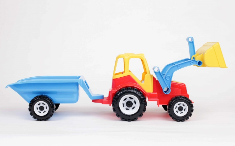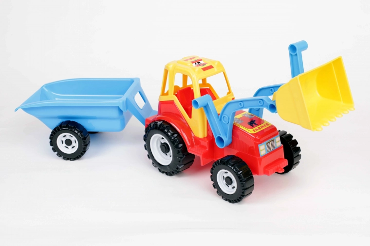 Tracteur avec chargeur frontal permettant de lever le godet pour transporter le sable chargé. Le tracteur en plastique coloré est équipé à l’arrière d’une remorque à deux roues rappelant une grande brouette. Grâce à l’essieu à deux roues, la remorque se bascule facilement vers l’arrière après déconnexion, ce qui permet de vider son contenu. Le tracteur est en outre décoré d’autocollants originaux imitant des feux.