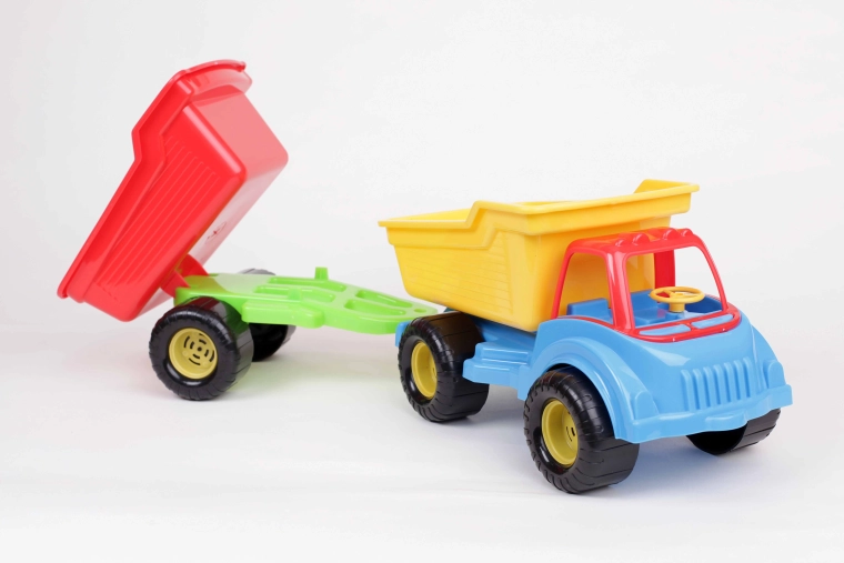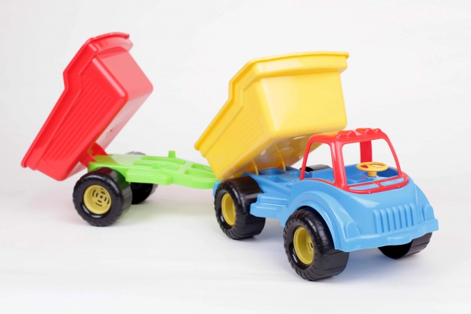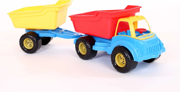 Camion-benne jouet avec remorque à timon torsionnel, idéal pour jouer dans le bac à sable ou sur la plage. C’est un excellent divertissement pour les petits constructeurs, car le camion et la remorque permettent de transporter des marchandises et du sable. La remorque peut être détachée.