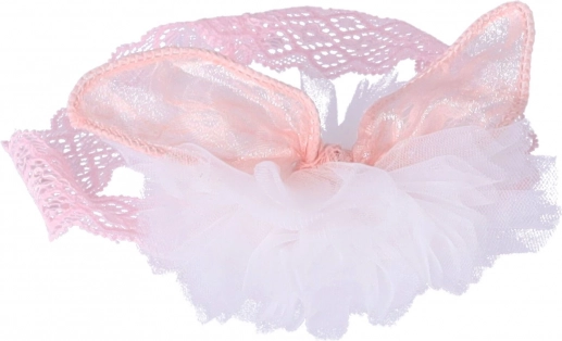 Serre-tête en dentelle rose avec pompon en tulle blanc et petites oreilles en tissu rose. Idéal pour les séances photo et les événements spéciaux.
