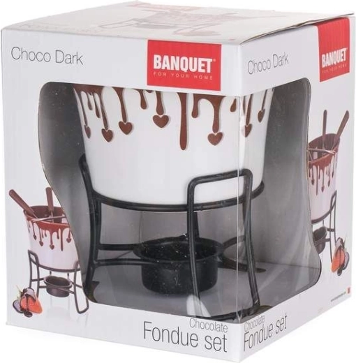Set de 6 pièces pour fondue au chocolat CHOCO DARK : 1x bol en céramique – diamètre 11,5 cm, hauteur 7,5 cm, 1x support avec porte-bougie – hauteur 8 cm, 4x fourchettes – longueur 15 cm, matériau acier inoxydable + PP.
