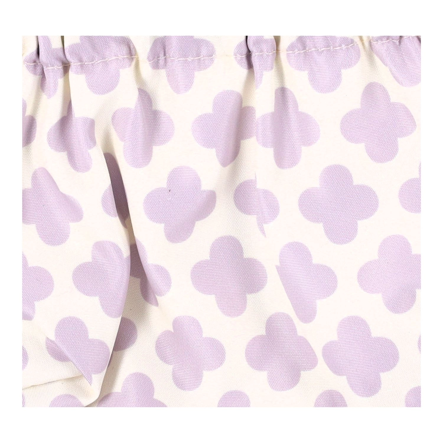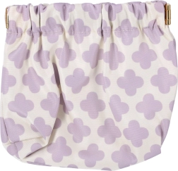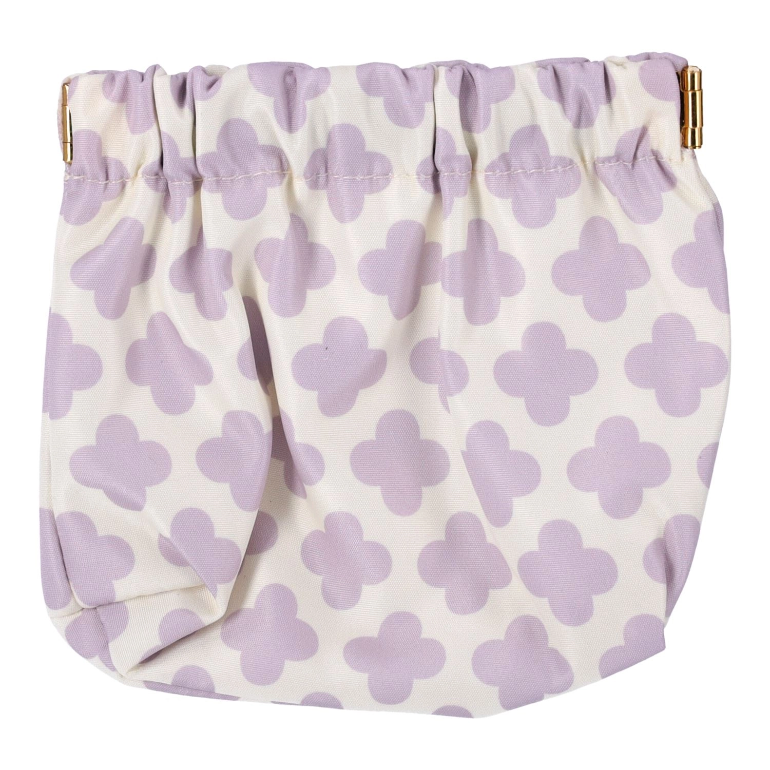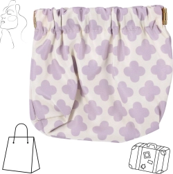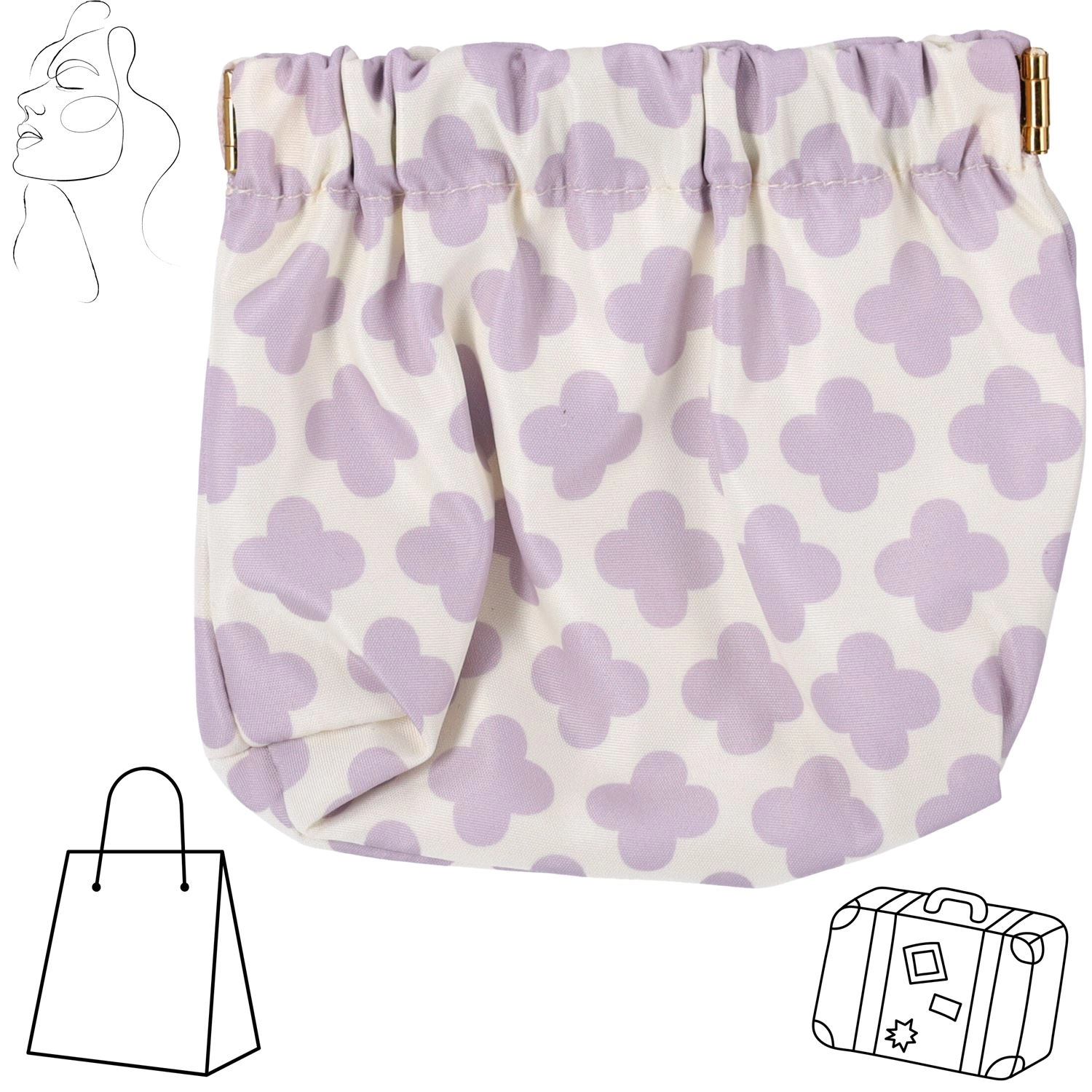 La trousse est fabriquée en textile de qualité avec un motif délicat et féminin dans une teinte lavande sur fond blanc. Le resserrage élastique permet une ouverture rapide et une fermeture fiable pour éviter que le contenu ne se renverse. Elle est légère, souple et garde très bien sa forme.