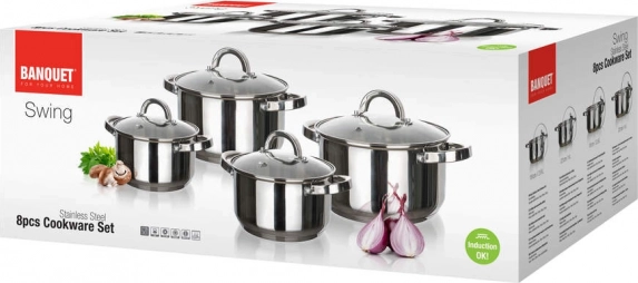 La batterie de cuisine Swing 8 pièces en acier inoxydable comprend : casserole 16 x 10 cm avec couvercle, casserole 18 x 11 cm avec couvercle, casserole 20 x 12 cm avec couvercle, casserole 24 x 14 cm avec couvercle. Compatible avec tous les types de plaques de cuisson. Les couvercles sont en verre trempé et disposent d’un orifice vapeur pour un contrôle optimal de la cuisson. Finition en acier inoxydable brillant (intérieur et extérieur). Prise en main aisée et compatible lave-vaisselle. Les poignées sont vissées à la casserole.