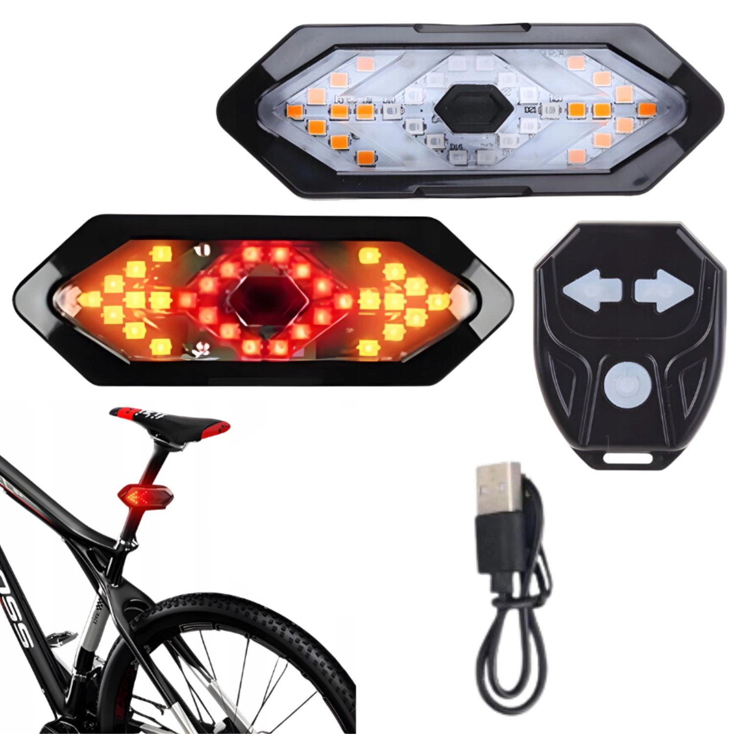 Feu LED avec clignotants, télécommande sans fil, câble de charge USB, sangle/support, manuel d’utilisation