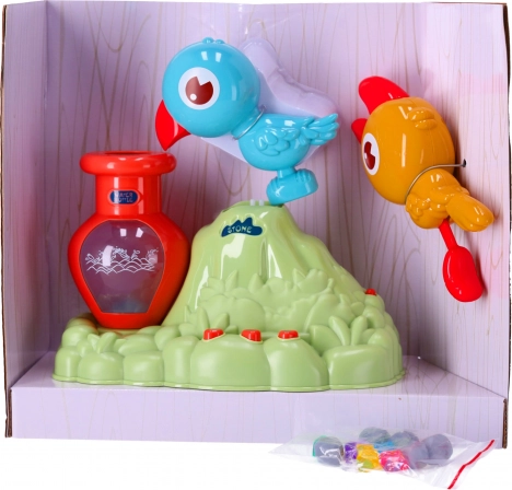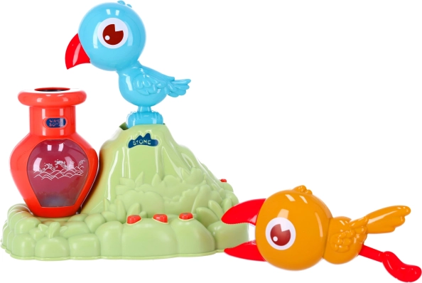 Le jouet inclut également une maman oiseau qui apporte des galets à l’enfant. Le tout-petit peut exercer sa motricité fine en insérant ces galets dans la petite cruche. Pour retirer les galets du jouet, il suffit d’utiliser la fenêtre à l’arrière.