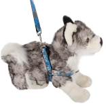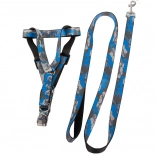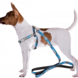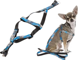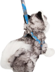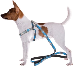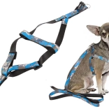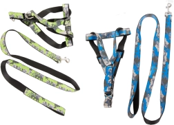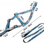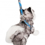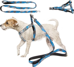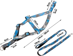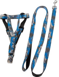 La longueur du harnais se règle facilement grâce aux boucles en plastique réglables, et la laisse s’attache et se détache en un instant grâce au mousqueton métallique. La poignée antidérapante assure une tenue ferme même lors de longues promenades. L’ensemble est idéal pour les races petites et moyennes et est disponible dans un motif camouflage moderne en bleu ou en vert.