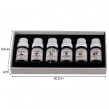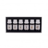 L'ensemble contient six parfums différents : eucalyptus, orange, tea tree, menthe, lavande et pin. Chaque huile est soigneusement scellée dans un flacon de 10 ml.
