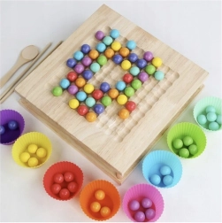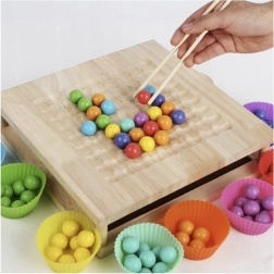 Manipuler les billes avec la pince, les baguettes et la cuillère favorise la bonne préhension, la précision des mouvements et la concentration – un apprentissage par le jeu de style Montessori idéal.