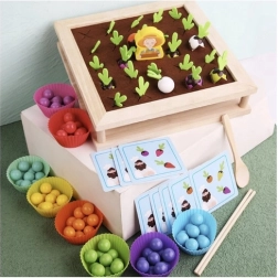 Ce jeu éducatif en bois 2-en-1 associe jeu libre et apprentissage. Les enfants peuvent « planter » et récolter des pièces de légumes en feutrine dans le potager, trier et compter des perles par couleur dans des coupelles, ou jouer au memory avec des cartes thématiques. Le plateau en bois robuste est double face : un côté est dédié à l’insertion des billes et à l’entraînement de la prise, l’autre à un jeu de ferme axé sur la mémoire et l’observation.
