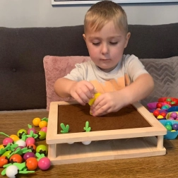 Le plateau double face offre une matrice de perles pour trier et insérer ainsi qu’un potager avec cartes pour jouer au memory. Les enfants alternent facilement les activités et entraînent différentes compétences.