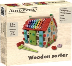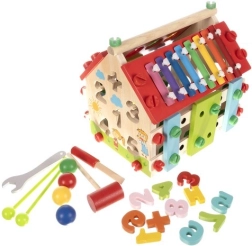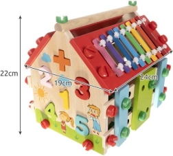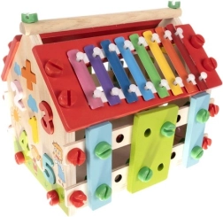 Chaque face de la maison propose des activités différentes qui favorisent le développement de l’enfant. Elle comprend des cymbales, des boîtes à formes et un petit marteau de jeu.