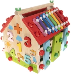 - Maison multifonctionnelle – chaque face propose une activité différente, comme des cymbales, des boîtes à formes et plus encore.