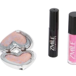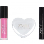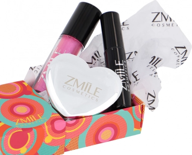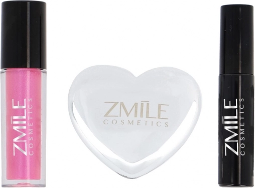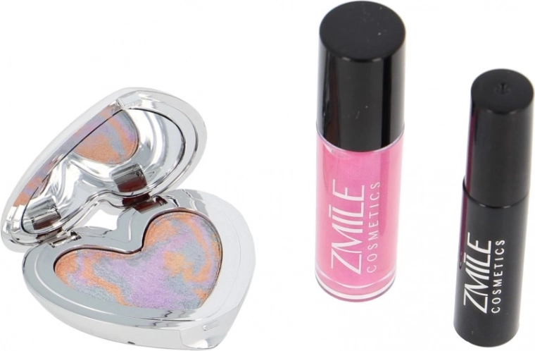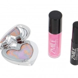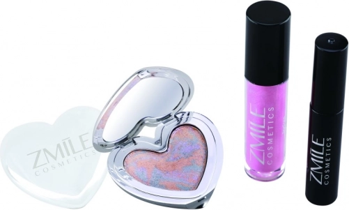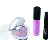 Un trio de produits – ombres à paupières dans une palette cœur, gloss et mascara – constitue un kit pratique pour un maquillage de jour comme de soirée.