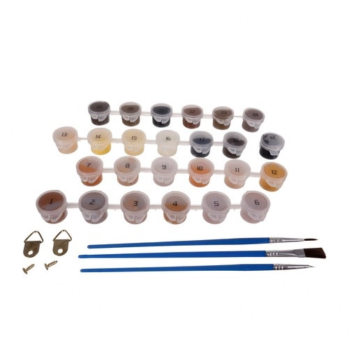 - Toile sur châssis en bois, set de peintures acryliques, 3× pinceau, modèle de référence, 2× crochet + vis, 2× crochet adhésif sans traces