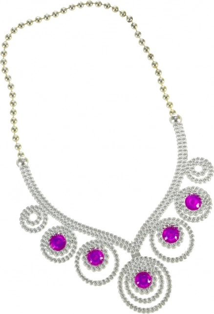Une tiare argentée ornée de pierres roses, un collier assorti et des boucles d’oreilles apportent un éclat enchanteur à chaque tenue. Deux bagues complètent l’ensemble dans les moindres détails.
