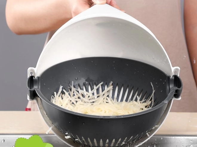 La passoire rotative simplifie le travail en permettant un drainage immédiat de l'eau excédentaire après la découpe. Elle peut également être utilisée pour égoutter les pâtes ou la salade. La râpe est équipée d'une poignée avec des piques qui protègent les doigts des coupures.