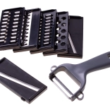 Grâce à cet ensemble, préparez facilement des frites, une salade de concombre, du fromage râpé ou des pommes pour une tarte. La râpe peut être placée confortablement sur le bol et l'accessoire approprié peut être choisi de sorte que les produits râpés ou tranchés tombent directement dans le bol.