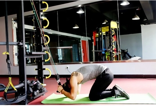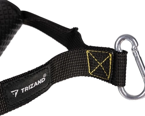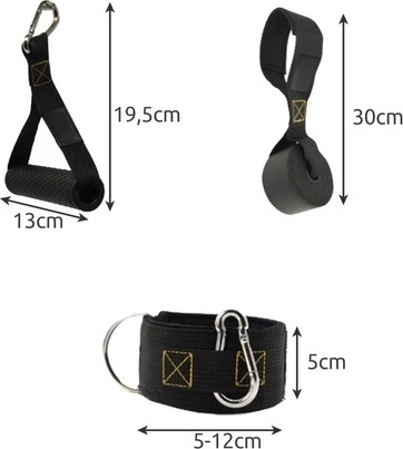 Des éléments métalliques résistants assurent une connexion rapide, stable et sécurisée des bandes avec la poignée, la sangle de cheville ou l’ancre de porte.