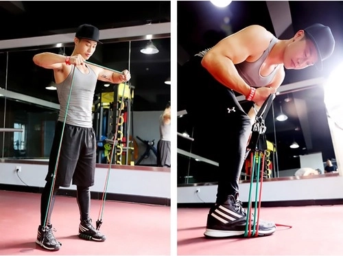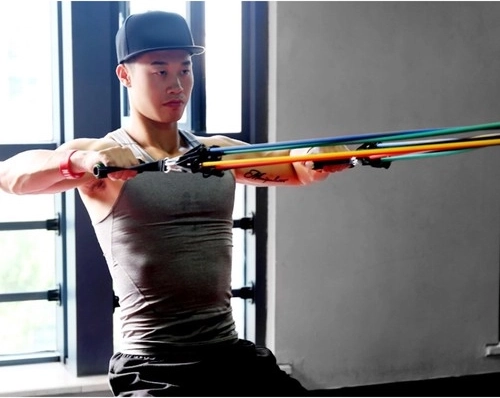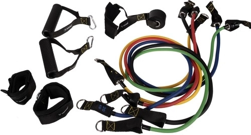 - 5 bandes de résistance, 2 poignées, 2 sangles de cheville, 1 ancre de porte, sac de transport