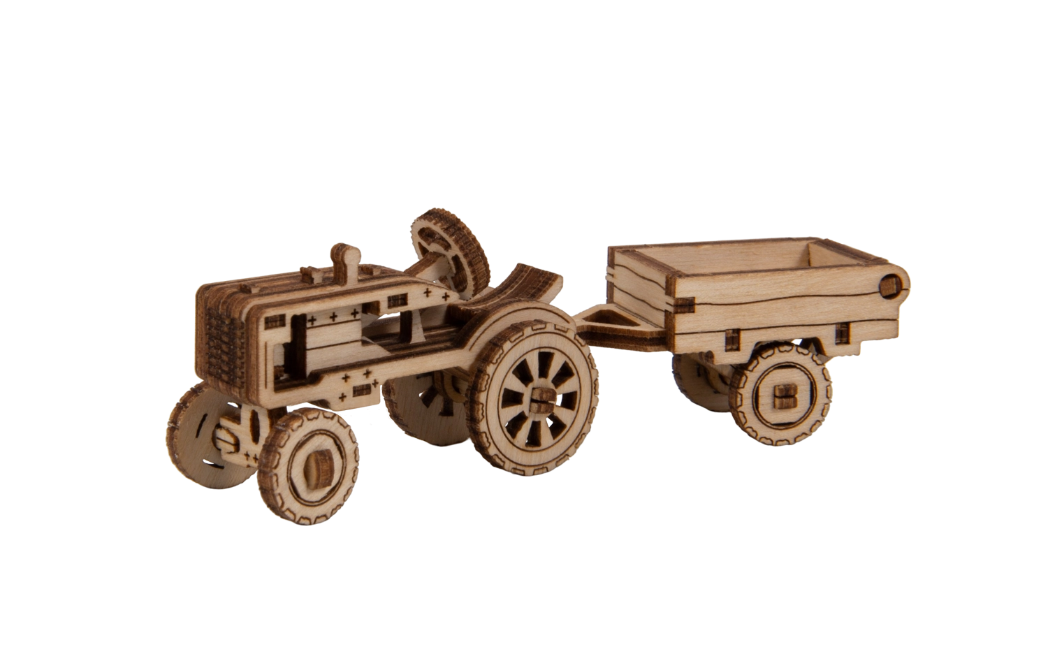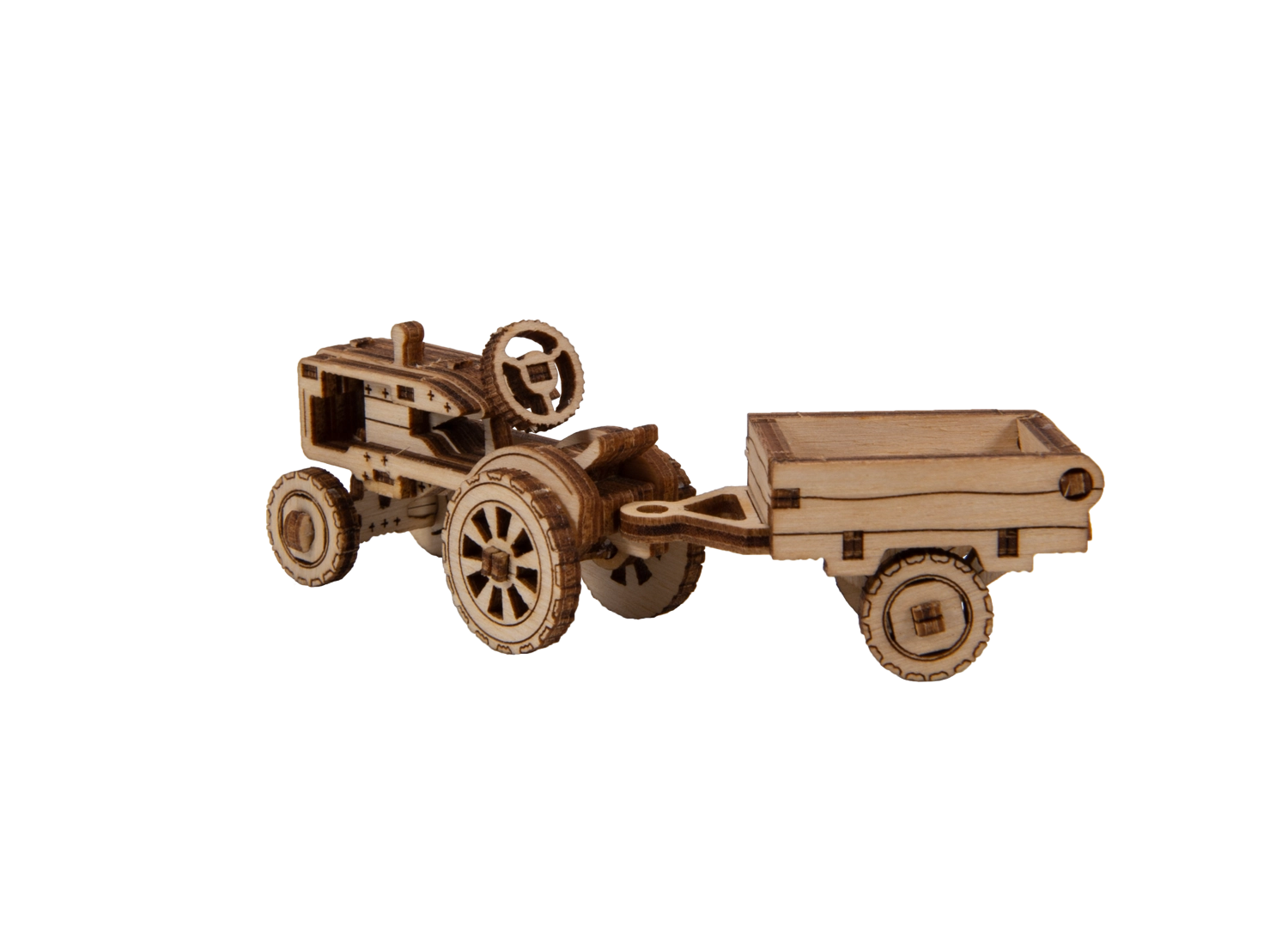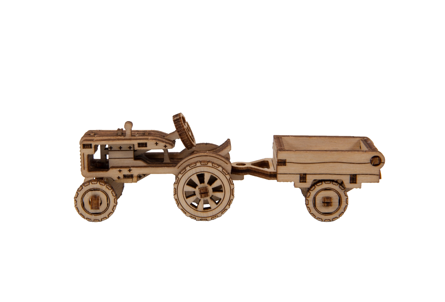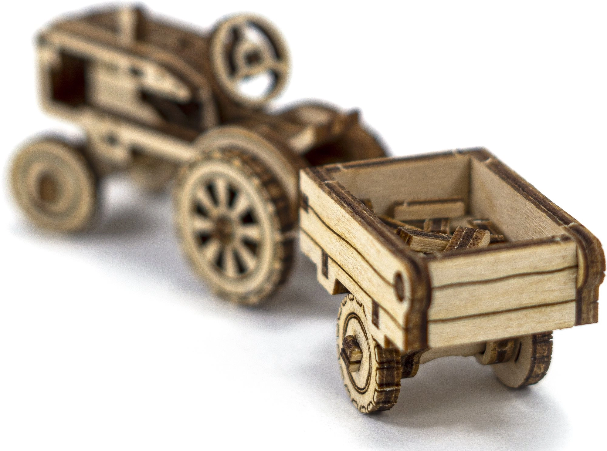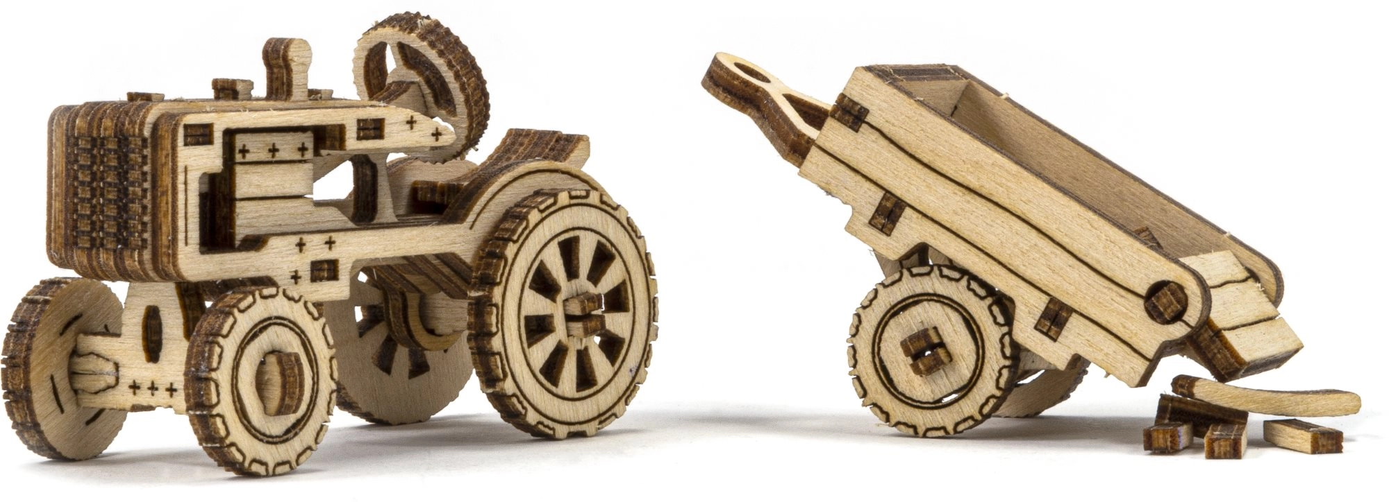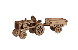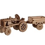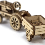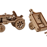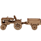 Le modèle de tracteur avec remorque possède des roues mobiles et de riches gravures. La remorque peut être inclinée – idéal comme décoration en bois impressionnante.