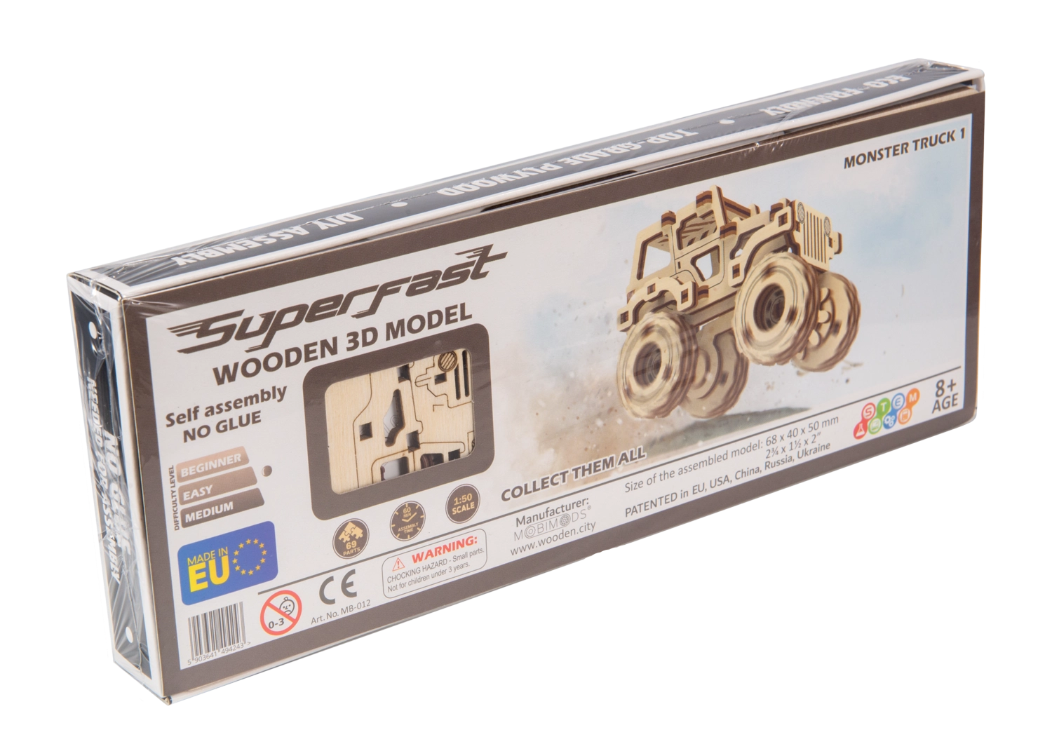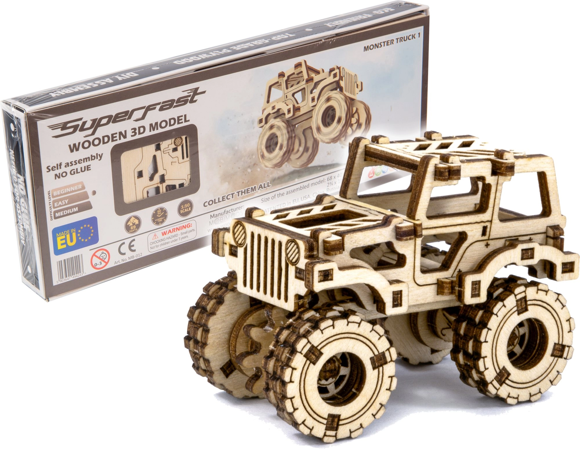 Offrez-vous le plaisir du montage avec le puzzle 3D en bois Monster Truck Superfast. Grâce aux découpes laser précises, les pièces s’ajustent parfaitement, et vous obtenez un modèle stylé avec un mouvement fonctionnel des roues – idéal à exposer comme pour de courts trajets sur le bureau.