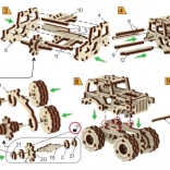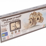 Le modèle est fabriqué en contreplaqué de qualité, se monte sans colle ni outils et convient aussi aux débutants. Pour un mouvement mécanique fluide, il suffit de lubrifier légèrement les engrenages et axes avec de la cire (par ex. une bougie), ce qui réduit les frottements et augmente la durabilité.