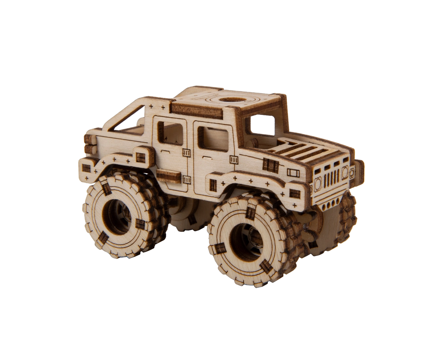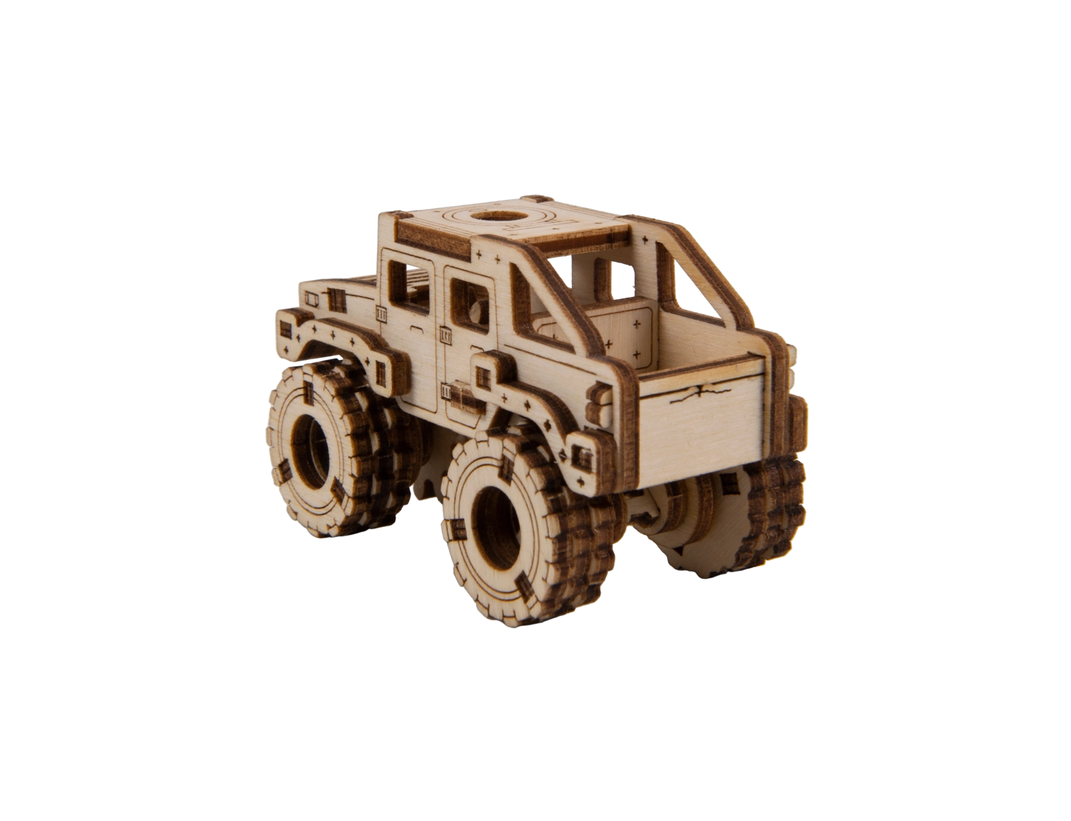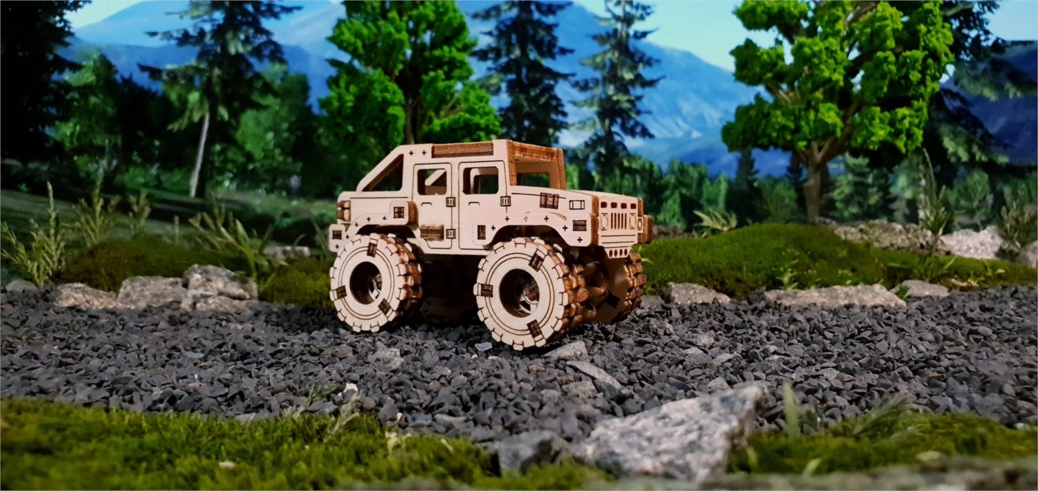 Ce modèle Monster Truck 2 est conçu pour un montage rapide et agréable – sans colle, sans désordre, avec un maximum de plaisir au résultat. Grâce aux découpes laser précises, les pièces s’emboîtent parfaitement et, au bout de 30 minutes, vous obtenez une voiture robuste aux grandes roues, parfaite sur une étagère ou un bureau.