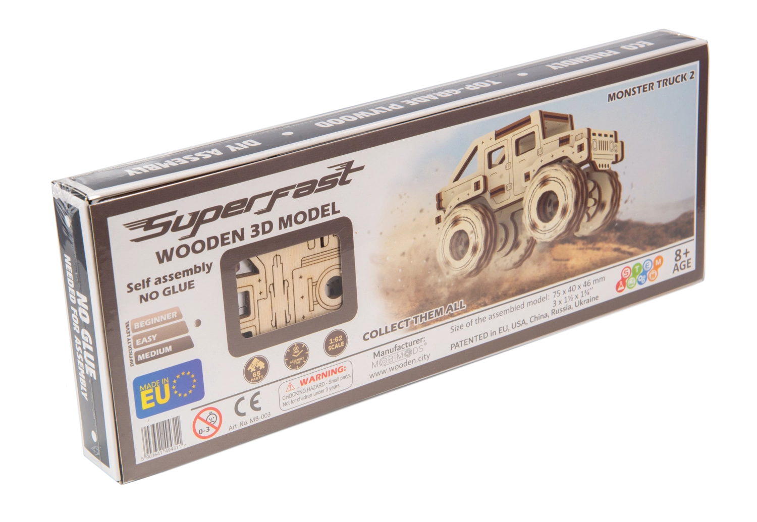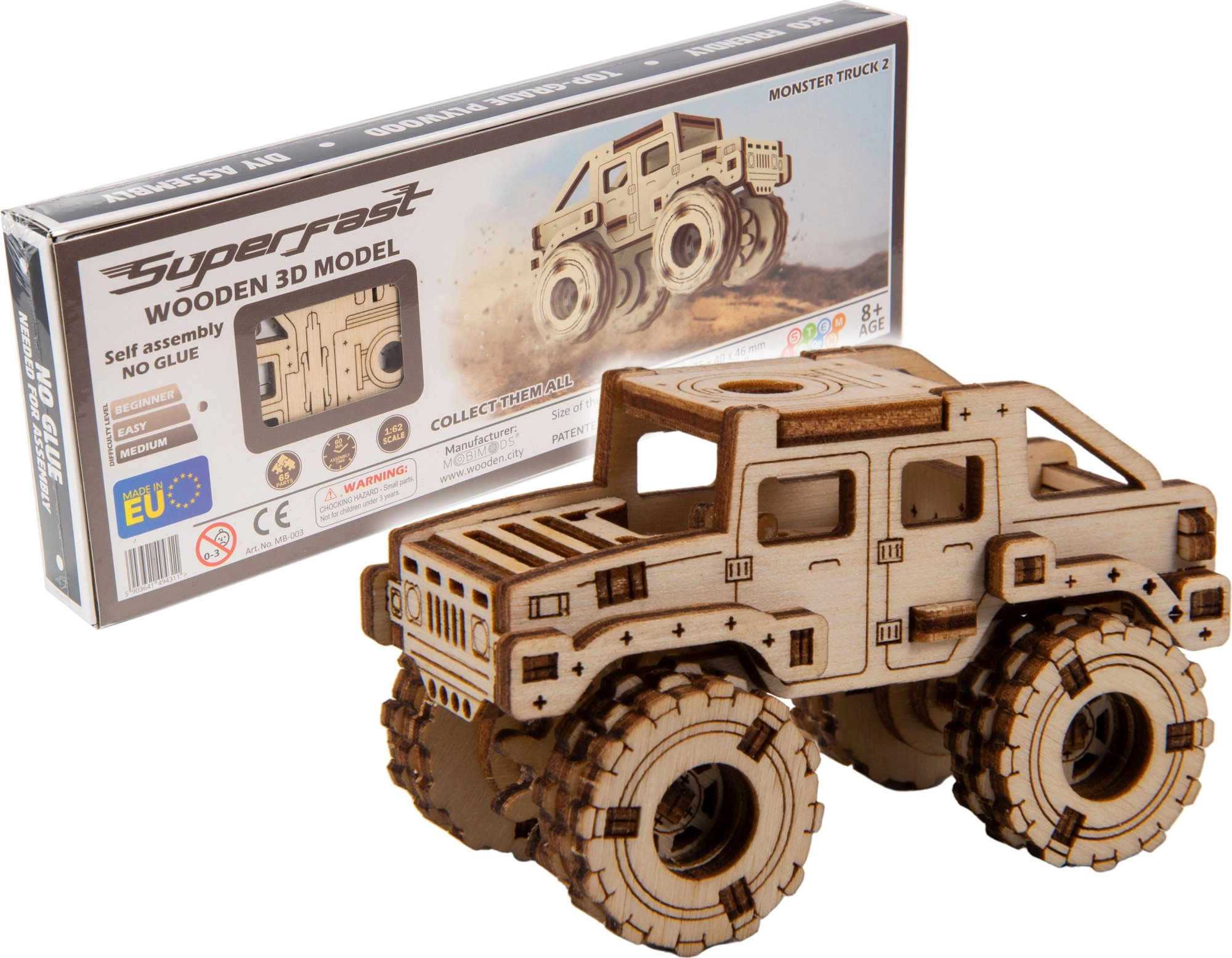 Fabriqué à partir de matériaux écoresponsables, il respecte la durabilité – sans emballages plastiques. Vous pouvez en plus le peindre selon votre imagination pour l’harmoniser avec votre intérieur ou votre collection. Parfait pour les fans de monster trucks, les enfants dès 8 ans et les modélistes adultes.