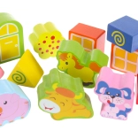 Les blocs en bois colorés avec des ouvertures de formes correspondantes aident les enfants à s’entraîner au tri, à la logique et à la reconnaissance. Certaines pièces représentent des animaux de la ferme, ce qui enrichit naturellement leur vocabulaire et leur imagination.