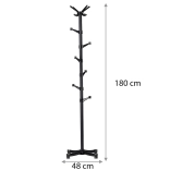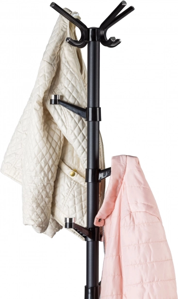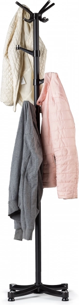 Six bras placés plus bas facilitent l’accès aux utilisateurs de petite taille, tandis que la partie supérieure avec des crochets supplémentaires offre suffisamment d’espace pour manteaux, écharpes ou sacs à main. Quatre pieds largement écartés assurent la stabilité même sous une charge plus élevée et des patins en caoutchouc protègent le sol contre les rayures.