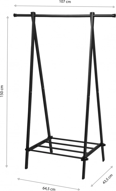 La tringle supérieure accueille vestes, manteaux et chemises, tandis que l’étagère inférieure offre de la place pour les chaussures, boîtes ou accessoires. L’acier robuste peint par poudrage garantit une longue durée de vie et un entretien facile.